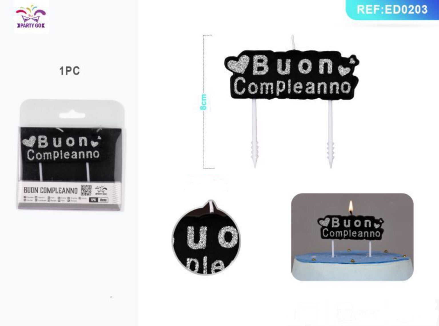 CANDELE buon compleanno glitterate argento 8cm 1pz