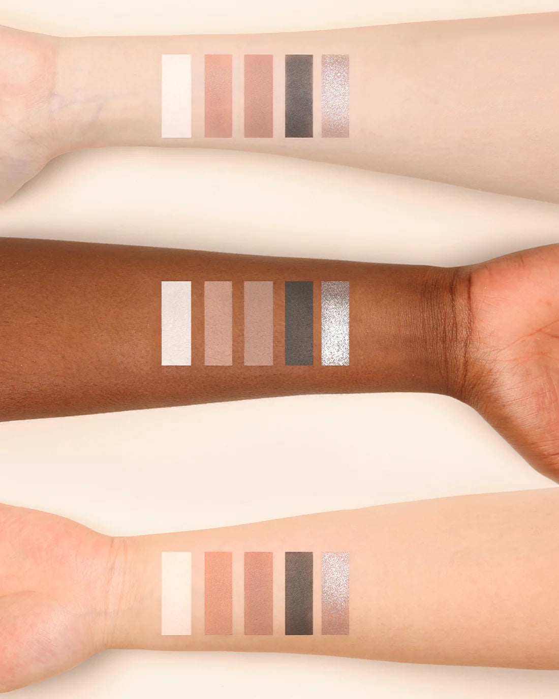 Experience shade 01 Hazel Fawn, with neutral cool tones of ash brown and slate gray, enhanced by a pure matte nude for depth and contrast. A touch of platinum shimmer adds a dazzling finish, perfect for creating sultry smoky looks or everyday elegance.