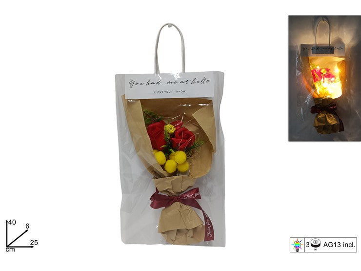 BUSTA REGALO CON BOUQUI ROSA MIMOSA CON LUCE